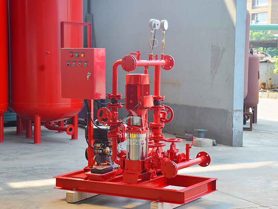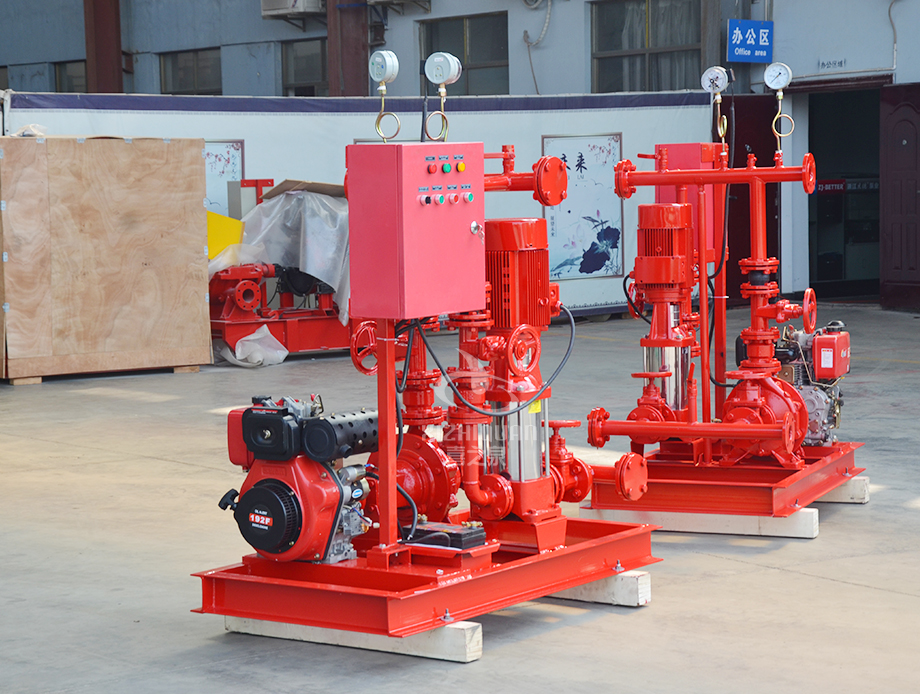 2.在市電正常時電動泵組投入工作,當供電出現故障,電動消防泵不能正常投入使用時,柴油機消防泵組能自動投入運轉確保消防滅火正常進行,柴油機消防泵組配置各種自動功能,滿足標準的要求,保證設備長期正常待機狀態(tài),隨時投入滅火工作。